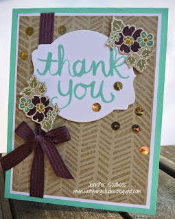 Hello I'm back again with another card using Hello Darling. I knew this set would get me motivated again. I also used the Handcarved background again as well. And then I used the new Watercolor Thank You stamp. This is just a single stamp to buy but it's so worth it. I love the font of this. I again did some embossing with the Hello Darling set. This time I used the outline flower image and embossed that twice on Crumb Cake cardstock with white embossing powder. I then colored in the flowers with Blackberry Bliss (LOVE!), Coastal Cabana, Pistachio Pudding and Hello Honey markers. The background was stamped in Crumb Cake and the Thank You sentiment was stamped in Coastal Cabana. To finish off the card I added Blackberry Bliss ribbon and gold sequins. I think this card would look great in other color options. I may try another color option or try out some of my other new goodies that I received the other day. Since I'm just sitting here waiting and waiting for this baby I might as well try to get some cards made. Of course there is stuff around the house to do but who wants to do that! :)